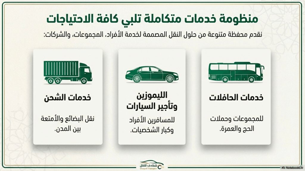 Shqadaf Company For Transportation (شركة شقادف) — ведущая транспортная компания, базирующаяся в священном городе Мекка. Мы специализируемся на предоставлении полного спектра логистических и пассажирских услуг, уделяя особое внимание обслуживанию паломников, совершающих Хадж и Умру.